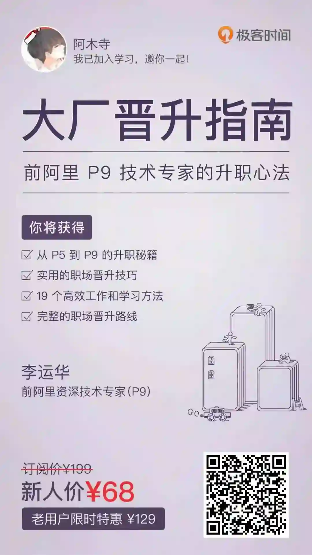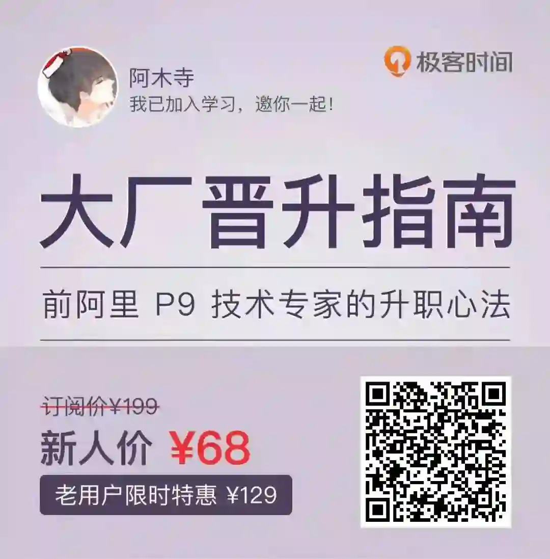 晋升这事儿,不像写代码,不能靠“头悬梁、锥刺股”的拼劲,而是“四两拨千斤”的巧劲儿。专栏里的内容,将晋升的标准和准备流程清晰化,让我们找到正确的发力点,真正把劲儿使对地方。