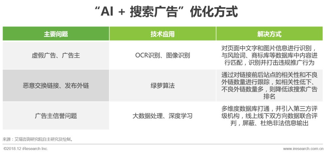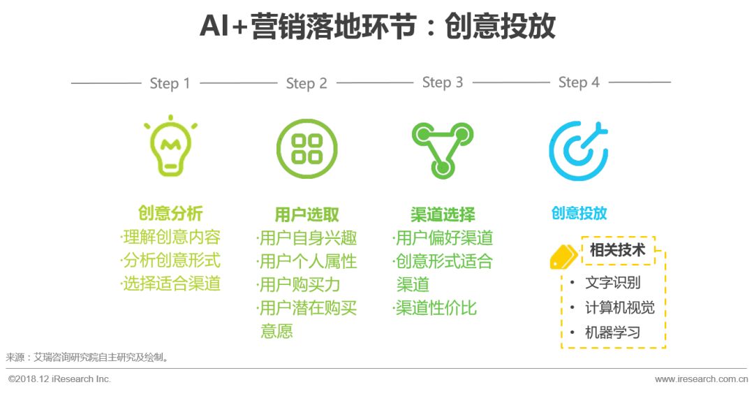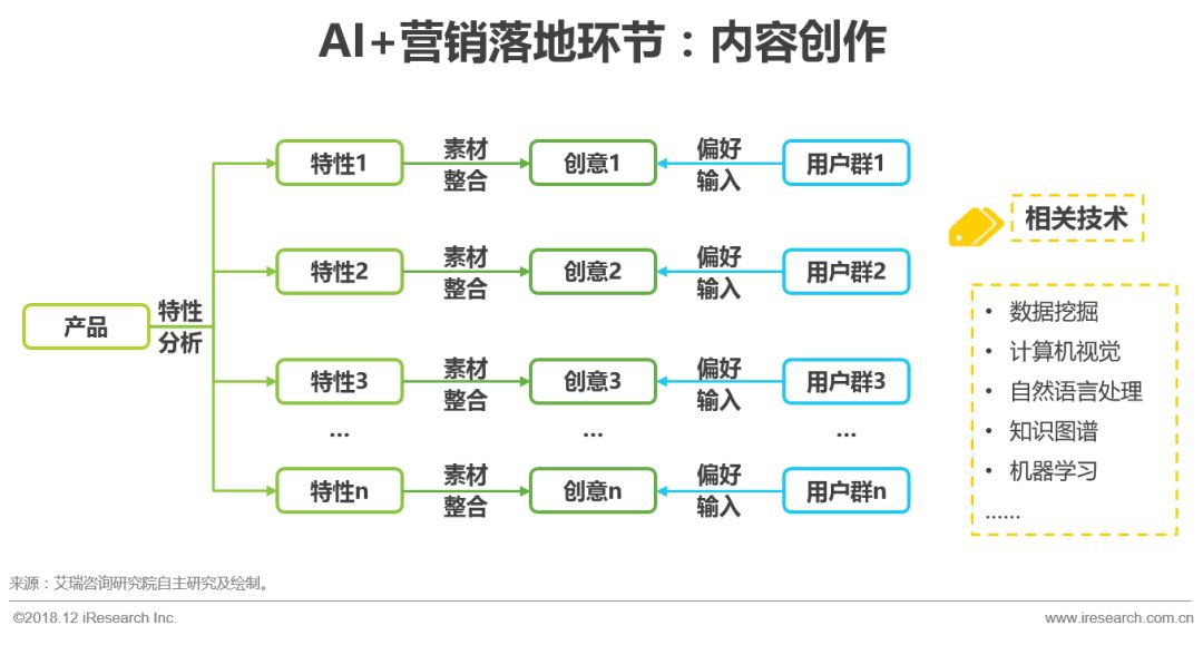 应用:通过数据挖掘、NLP、机器学习等关键技术,AI对传统营销各环节进行优化,在用户筛查、内容创作、创意投放、效果监测及行为预测等领域做出贡献,并对搜索广告、信息流广告和互动广告等多种营销方式进行革新,提升营销效果。
