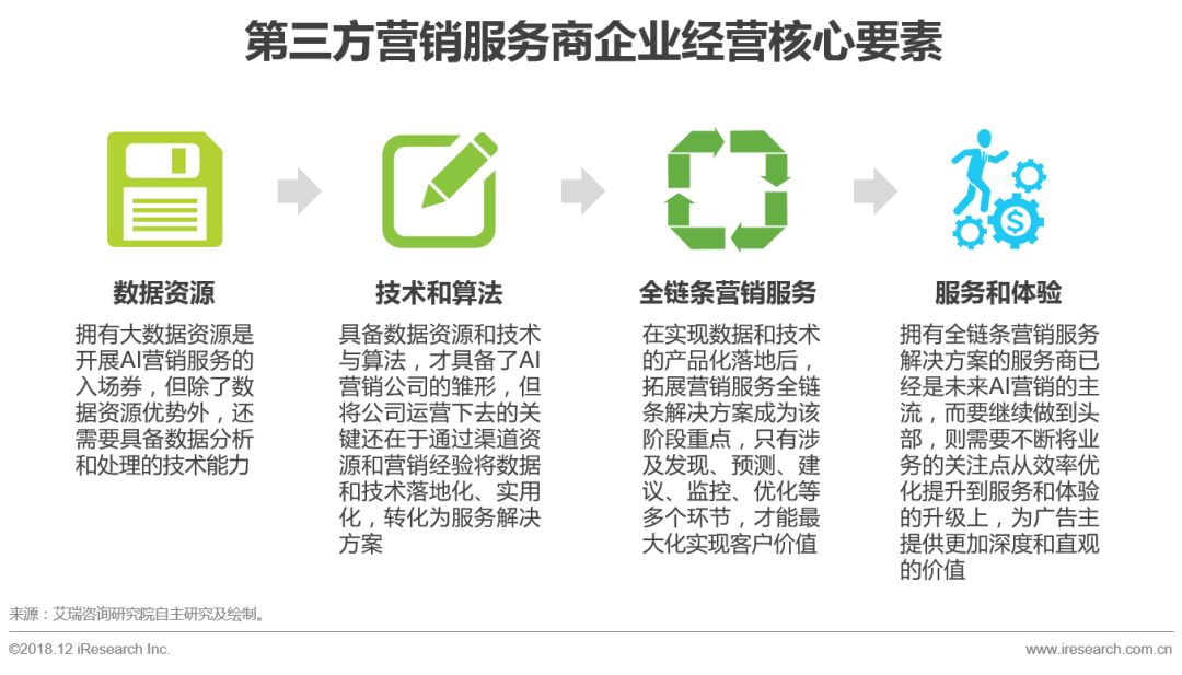 因此,第三方服务商在经营和发展中需要依次具备四个方面的要素:1)积累丰富的数据资源;2)探索研究领先的技术和算法;3)搭建覆盖全链条的营销业务体系和服务能力;4)在提高效率的基础上不断升级和优化更深层次的客户服务和体验。