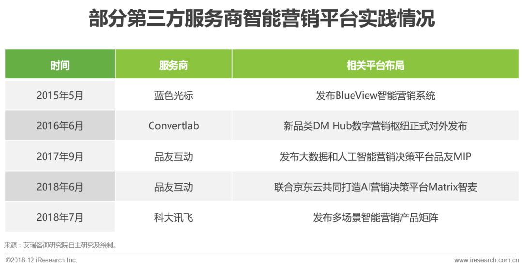 相比广告主和媒体方,AI营销第三方服务商没有直接的用户数据源,因此技术是其在产业链中的核心竞争力。从短期来看,第三方技术服务商需不断提升和优化自身所处领域的关键技术和服务水平,通过技术壁垒在用户洞察、创意生成、内容制作和效果监测等方面为广告主和媒体方提供不可或缺的帮助和作用。从长期来看,第三方技术服务商需要积极搭建智能营销平台,一方面培养广告主和媒体方对自身平台的习惯度和依赖度,另一方面开始积累合作资源,通过整合跨平台的二手数据,去巩固自身的营销价值。
