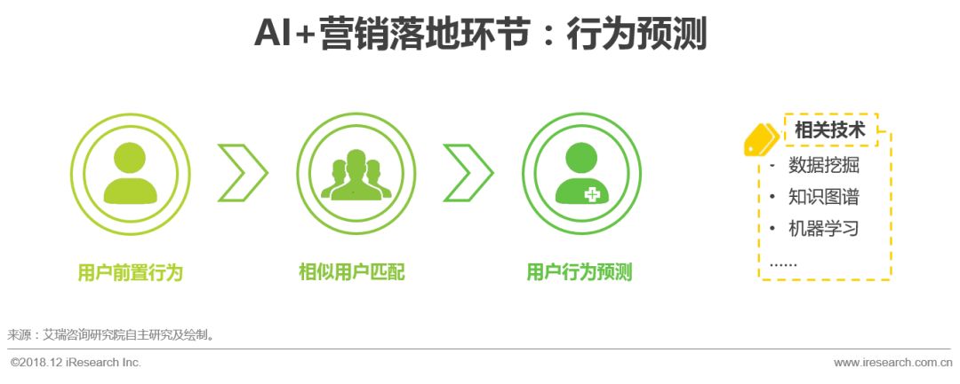 通过分析用户特征和行为确定用户兴趣并进行有针对性的营销活动无疑会有效提高营销效果,然而许多用户的需求会随着时间的推移而转变,因此更多的广告主希望更准确的发现在未来一段时间内会对自身产品有需求的潜在客户。在过去的营销之中,商家很难获取客户的——尤其是在不同领域中的——消费行为,更难以从中发现规律。而基于AI的数据存储以及对用户的洞察,商家可以对相似用户的消费行为进行对比,获得不同时期客户对于不同需求的意愿——无论是同行业或是跨行业的,并以此为依据制定有针对性的营销手段,从而提前占据市场有利位置。