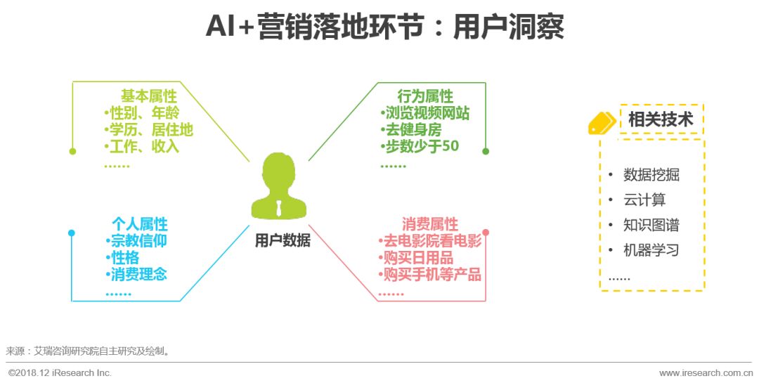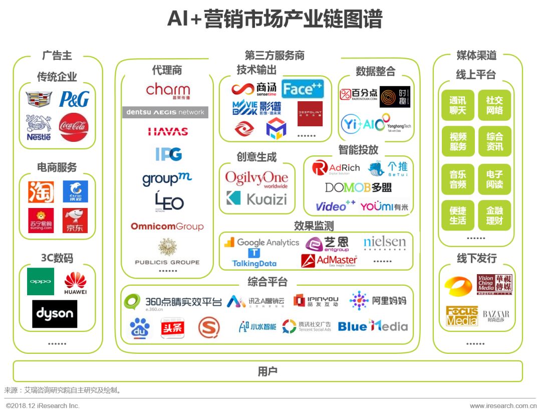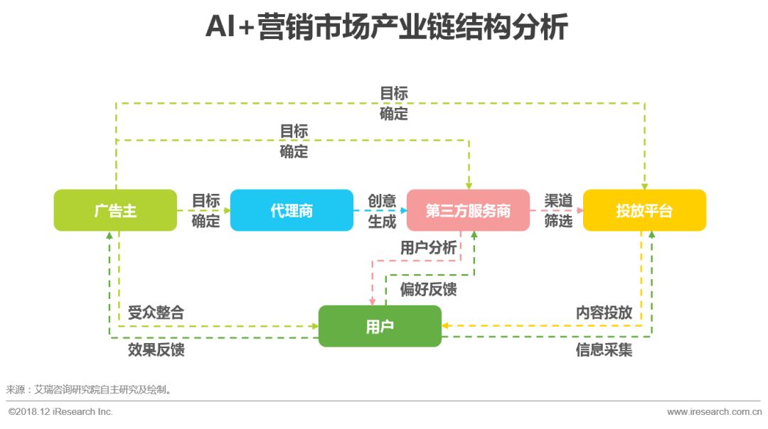 对于AI+营销市场产业链而言,通过AI技术的连携,使每个环节间几乎都可以产生联动,而这些联动的基础则是用户产生的各种数据。广告主、第三方企业和投放平台通过收集这些数据形成对用户的多维画像,从而对AI+营销活动各环节起到更好的指导作用,提高营销效率。而在整个AI+营销产业链条中,用户数据和处理用户数据的AI技术是产业发展的核心,也是产业中各方话语权的立足之本,因此未来各方都将在用户数据和技术上展开布局和竞争。