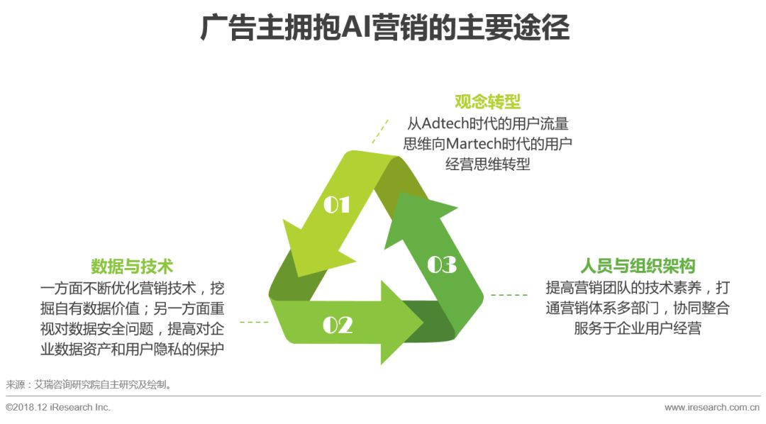 AI营销不仅仅是技术在Adtech上的应用深化,更是Martech发展和渗透的重要驱动力,而广告主积极拥抱AI营销的价值不仅仅在于通过技术优化营销效率和效果,更是在整个营销产业的变革升级中重新抓住市场和用户的机遇。因此,广告主拥抱AI+营销的关键,在于从观念上由Adtech时代的用户流量思维向Martech时代的用户经营思维转变,进而通过数据、技术和组织架构的优化,提高自身的Martech程度,实现企业数据资产化和用户资产化,发挥AI营销更深层次的价值和作用。