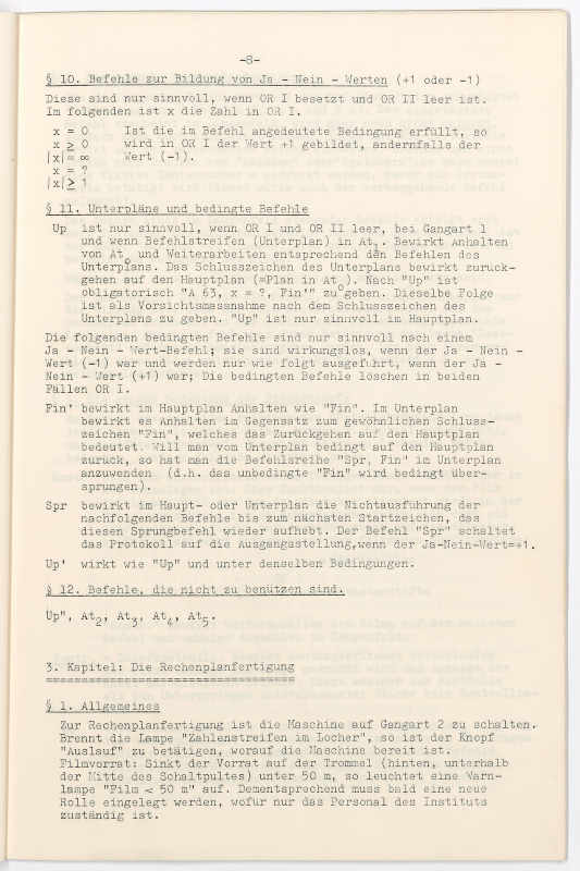 一开始,Z4 并不知道有条件跳转。在苏黎世联邦理工学院的要求下,这个功能被加了上去。但是,在几年前的一项调查中,少数几位见证过它且依然健在的人都不记得它的执行方式了。手册的第 8 页展示了那个年代执行有条件跳转的方式。