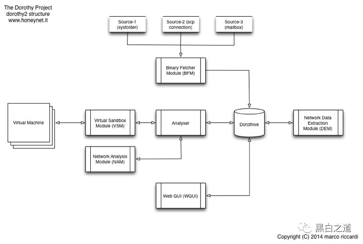 Dorothy2框架主要由五大模块组成,这些模块均可以单独运行。下面这张图片显示的是Dorothy2的框架结构图,其中的各个模块已相互连接: