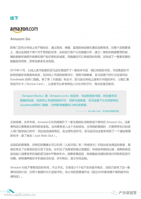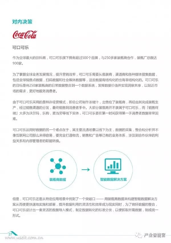 所谓「智能数据」是指那些真正能够应用于解决实际问题的大数据子集。在智能数据的运用上,企业面临的最大难题包括:数据收集、整合与分析以及实现数据应用的闭环。国外像亚马逊、可口可乐、荷兰皇家航空等公司其实已经在对内决策、对外的数据驱动营销以及客户体验的提升和优化上有了较为领先的智能数据实践。
