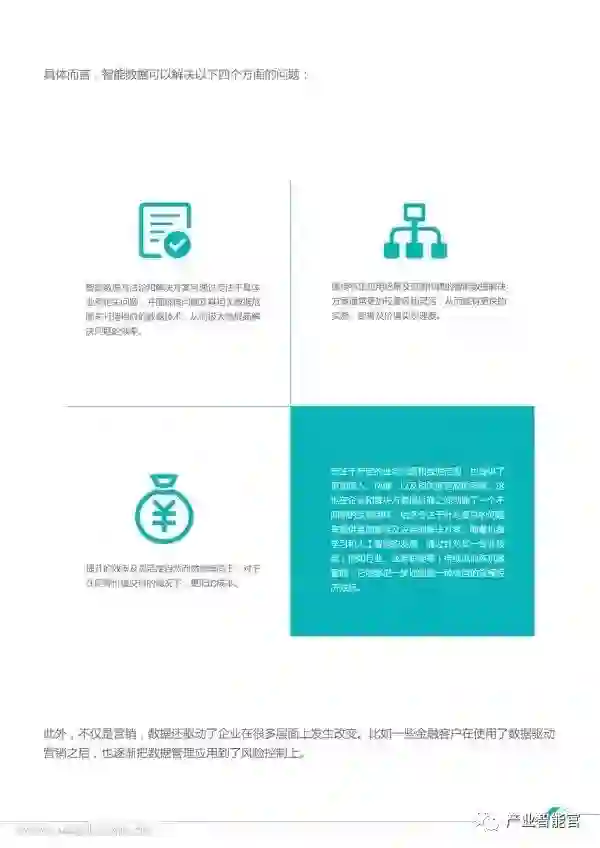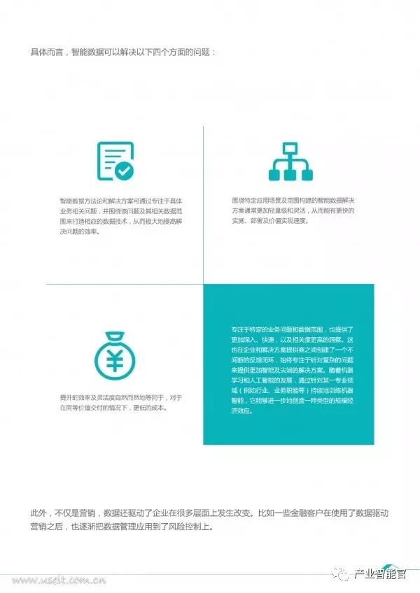 白皮书进一步指出,智能数据既指实际的大数据中结构性的数据子集,同时也意味着一套将智能数据应用于实际问题的一套技术与方法,包括数据收集、数据整合、数据细分和分析,以及数据开放式应用的四个步骤。