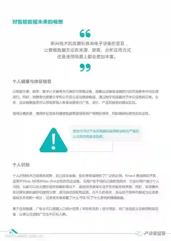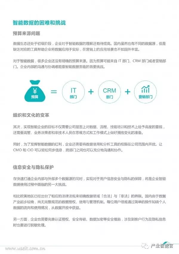 值得注意的是,预算来源、组织和文化的变革以及信息安全与隐私问题可能会是企业在智能数据的实际运用中遇到的挑战。而新兴技术的发展和各类电子设备的普及,让智能数据无论在来源、获取、分析应用方式还是使用场景上都会更加丰富。