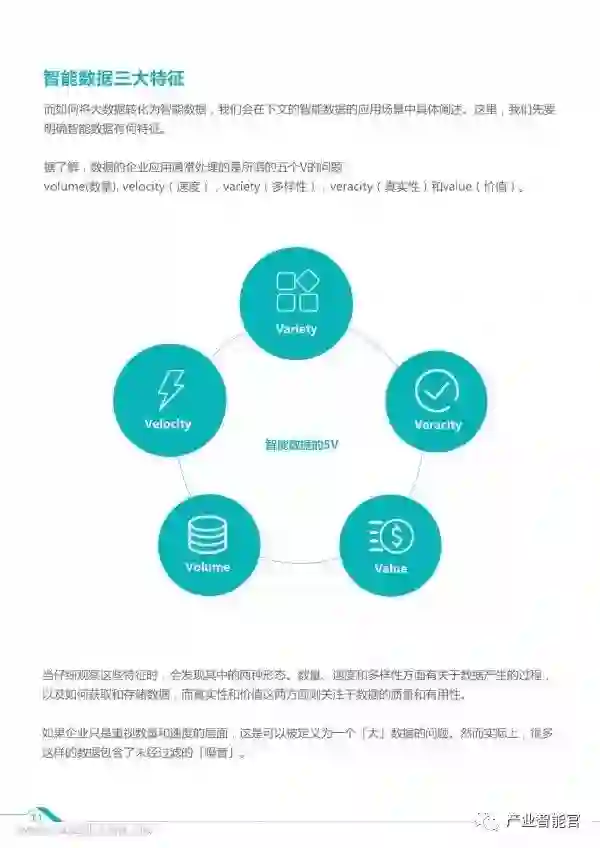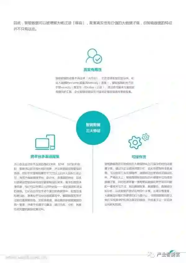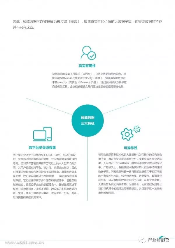 数量、速度和多样性与数据产生的过程,以及如何获取和存储数据有关,而真实性和价值这两方面则与数据的质量和有用性有关。从中我们不难发现,与充满噪音的大数据相比,智能数据的核心特征在于真实有用性、可操作性和跨平台多渠道搜集: