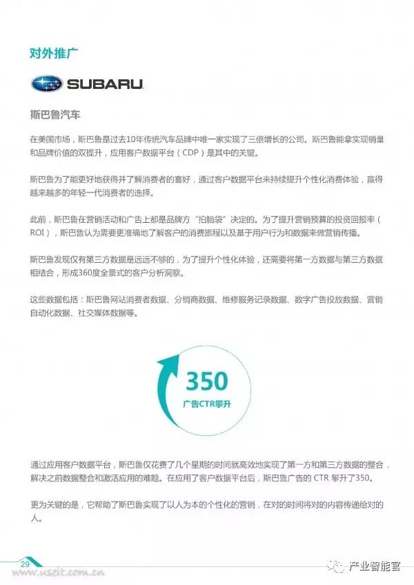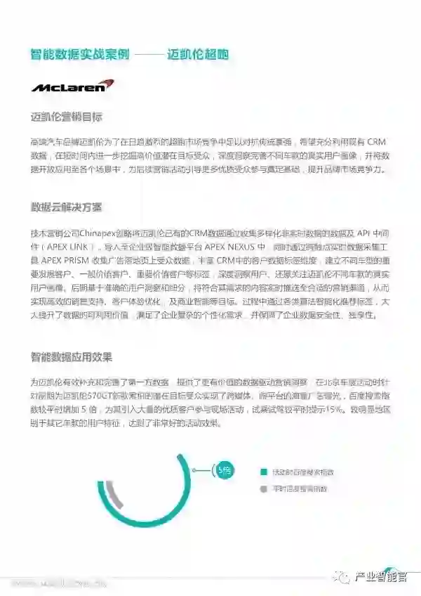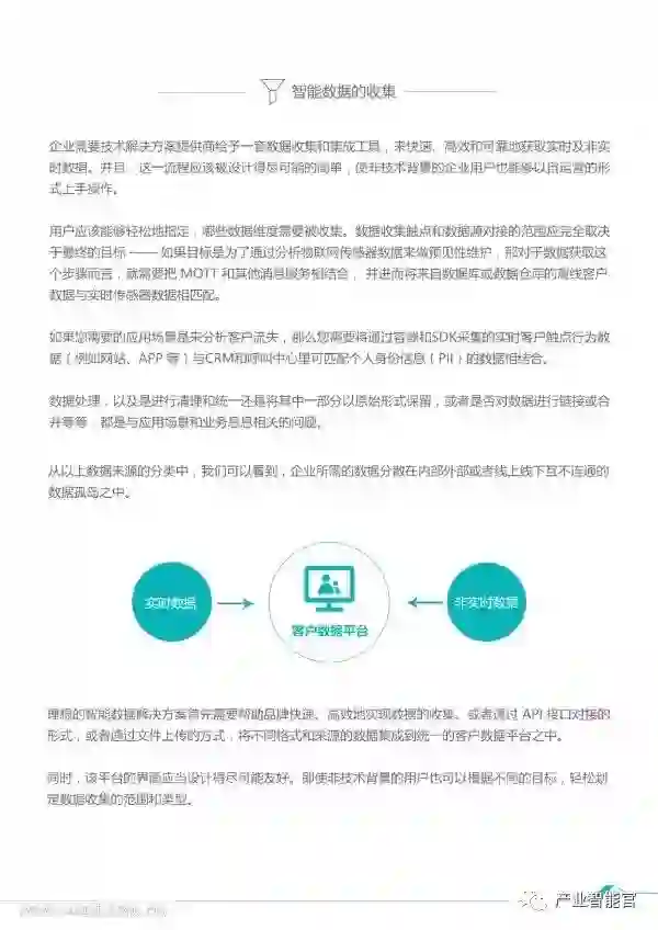 白皮书综述了智能数据的发展、概念和特征,重点梳理了智能数据的应用场景、解决方案,同时也对智能数据的的商业应用——客户数据平台(Customer Data Platform)解决方案的最佳实践案例进行了详细的介绍。