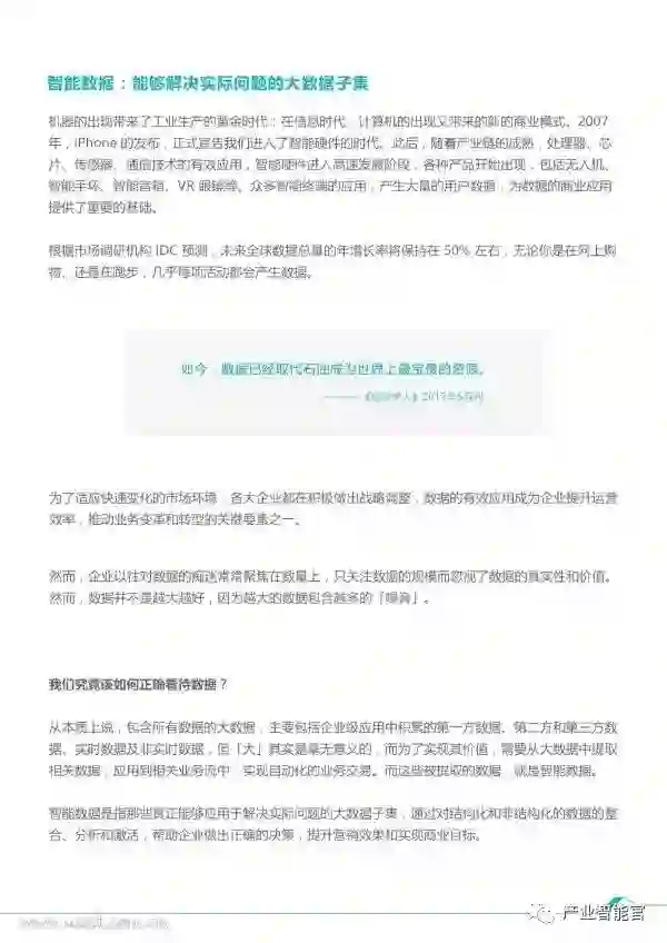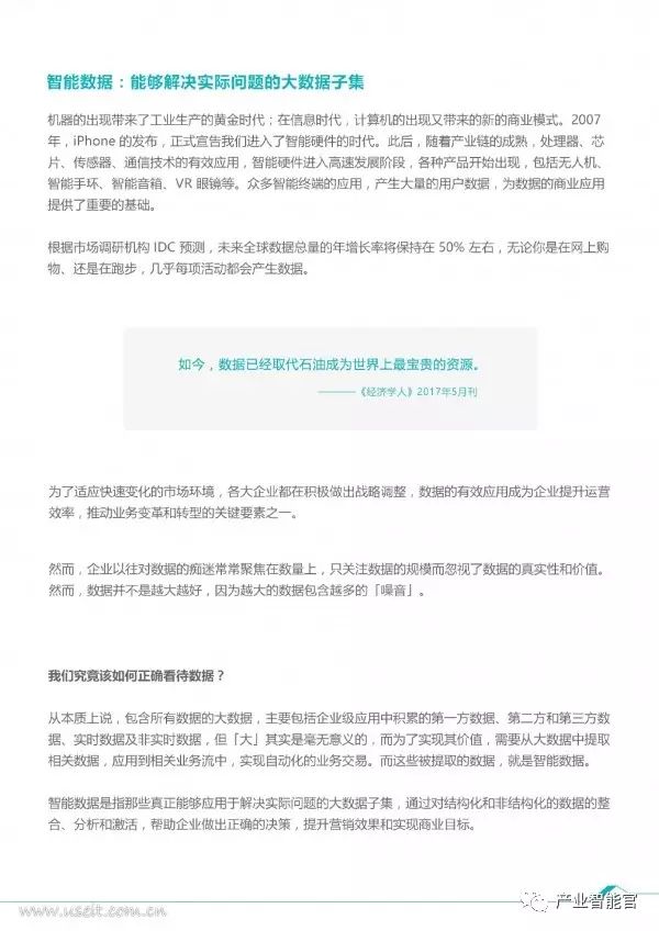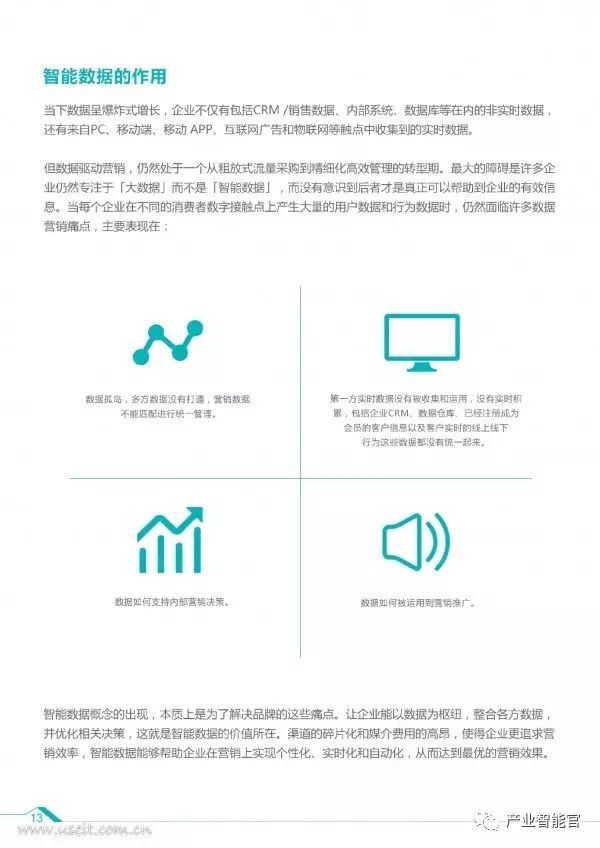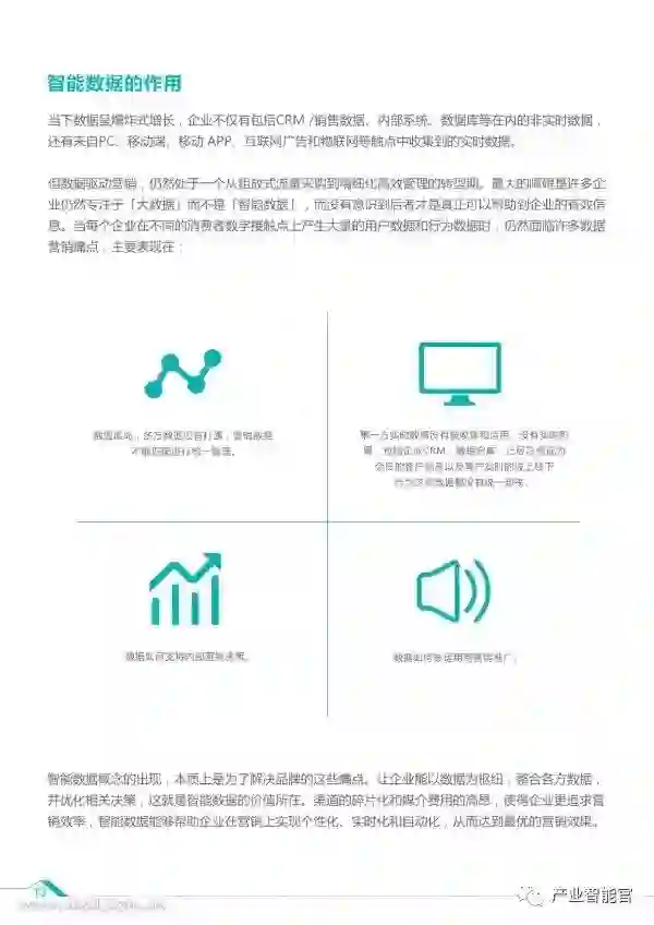 白皮书开篇首先回顾了智能数据的发展历史,并对其概念进行了界定:智能数据是指那些真正能够应用于解决实际问题的大数据子集,通过对结构化和非结构化的数据的整合、分析和激活,帮助企业做出正确的决策,提升营销效果和实现商业目标。