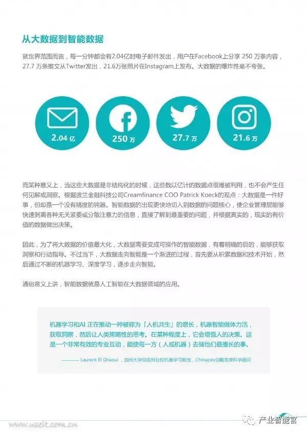 通俗意义上讲,智能数据就是人工智能在大数据领域的应用。根据加州大学伯克利机器学习教授,Chinapex 创略首席科学顾问 Laurent EI Ghaoui 的观点:机器学习和 AI 正在推动一种被称为「人机共生」的增长,机器智能做体力活,获取洞察,然后让人类策略性的思考。在某种程度上,它会增强人的决策。这是一个非常有效的专业互动,能使每一方(人或机器)去做他们最擅长的事。