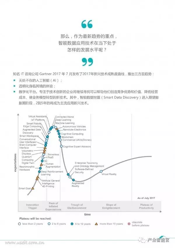 根据知名 IT 咨询公司 Gartner 7 月发布了2017年新兴技术成熟度曲线。推出三方面趋势:1. 无处不在的人工智能(AI) 2. 透明化身临其境的体验 3. 数字化平台。专注于技术创新的企业将继续寻找可以帮助他们创造竞争优势和价值、降低经营成本、使业务模型转型的新技术。 其中,智能数据挖掘(Smart Data Discovery)进入期望膨胀期阶段,2到5年的将成为主流应用新兴技术。