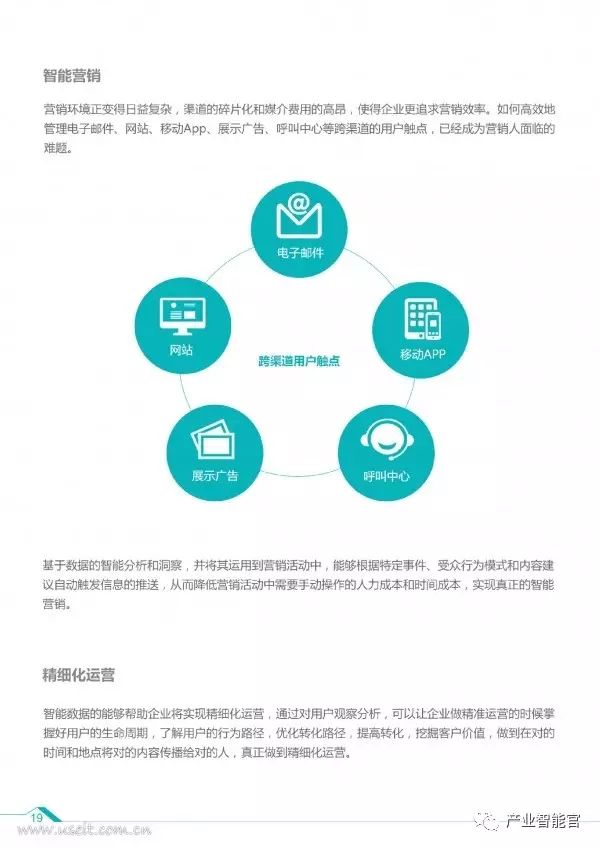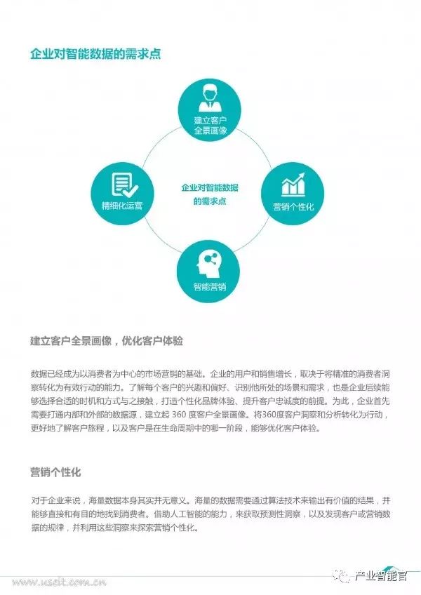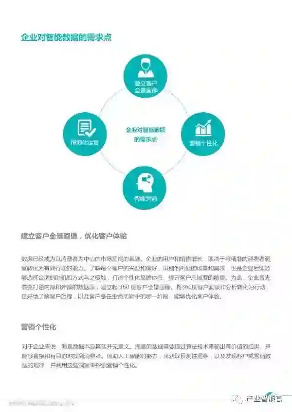 根据白皮书的观点,企业在不同的消费者数字接触点上产生大量的用户数据和行为数据时,面临的数据营销痛点主要表现在:针对这些痛点,智能数据解决方案的出现能够满足企业在建立 360 度客户全景画像、营销个性化、智能营销和精细化运营上的需求。