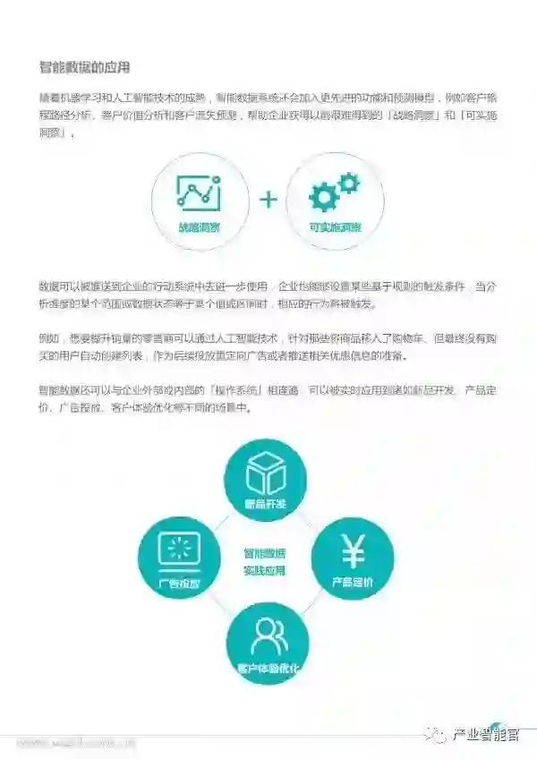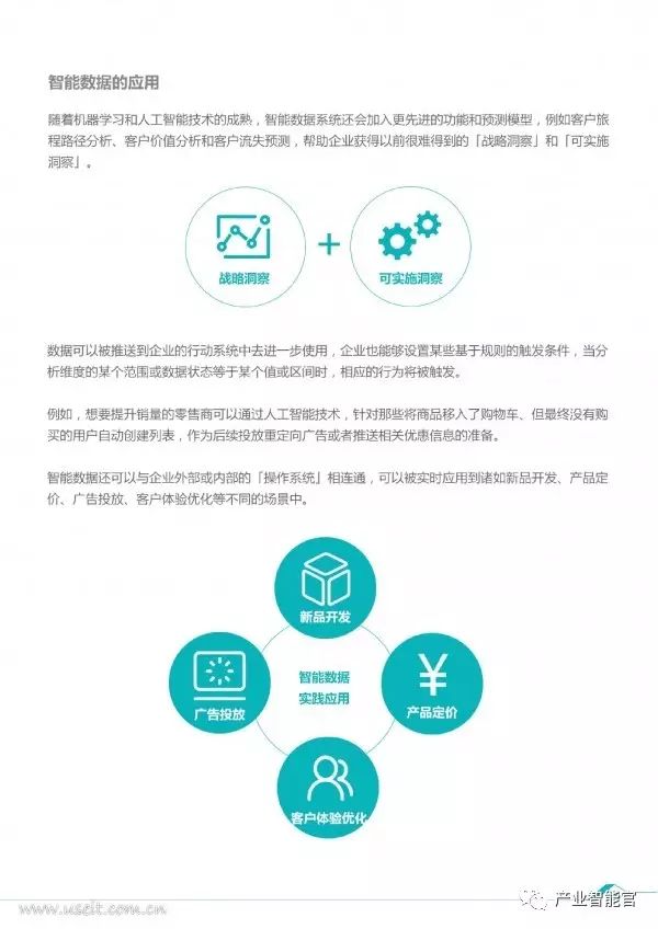 例如,想要提升销量的零售商可以通过人工智能技术,针对那些将商品移入了购物车、但最终没有购买的用户自动创建列表,作为后续投放重定向广告或者推送相关优惠信息的准备。智能数据还可以与企业外部或内部的「操作系统」相连通,可以被实时应用到诸如新品开发、产品定价、广告投放、客户体验优化等不同的场景中。
