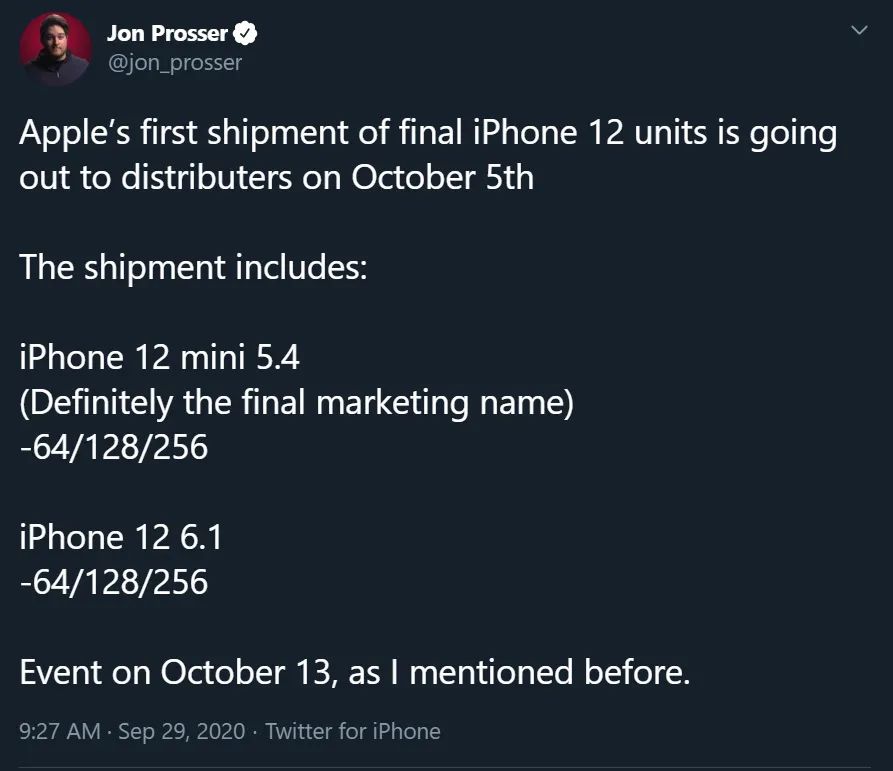 据消息人士 Jon Prosser 报道,苹果首批 iPhone 12 将于 10 月 5 日向分销商交货,包括 5.4 英寸的 iPhone 12 mini 以及 6.1 英寸的 iPhone 12 手机。据他表示,iPhone 12 mini 将肯定会是 5.4 英寸机型的最终名称。另外,两款产品都会有 64/128/256GB 存储空间可选。