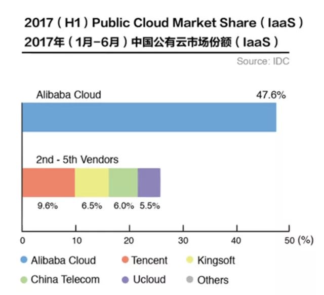 11月1日,权威研究机构IDC发布了2017年上半年中国公共云IaaS市场份额调研结果。数据显示,阿里云市场份额比2016年底上升7个百分点,市场份额扩大至47.6%,领先优势不断扩大。同期,市场第2至5位云服务商市场份额分别为9.6%、6.5%、6%和5.5%。