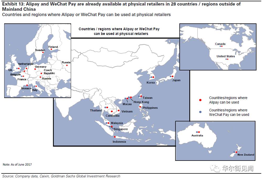 中国消费者已经可以在境外28个国家和地区使用第三方线上支付。(支付宝:28,财付通:15)