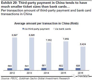 在中国,传统银行卡已经退居为大件交易的支付途径,平均单笔交易额为6424人民币;而第三方支付单笔交易额平均为606人民币,前者是后者的将近十倍。