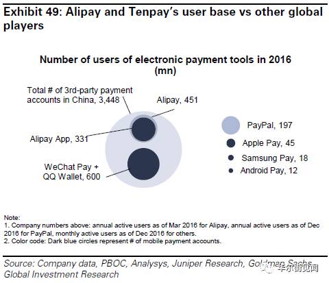 截止2016年,中国共有34亿第三方支付账户。其中支付宝有5.2亿账户(2017年3月数据),财付通有6亿用户(2016年12月数据)。而相比之下,Paypal全球仅有1.97亿用户(2016年12月数据)。