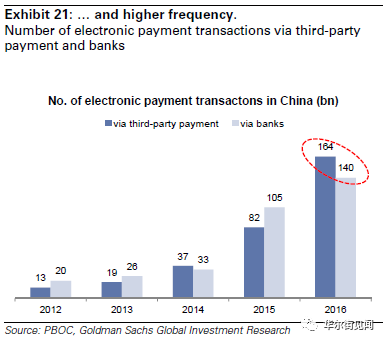 通过第三方平台完成电子支付笔数在2016年达到1640亿次,超过银行平台的1400亿次