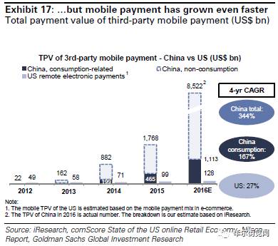 2016年中国移动支付体量已达到美国同行规模的70倍,而其中消费相关的支付规模亦达美国同行规模的8倍。