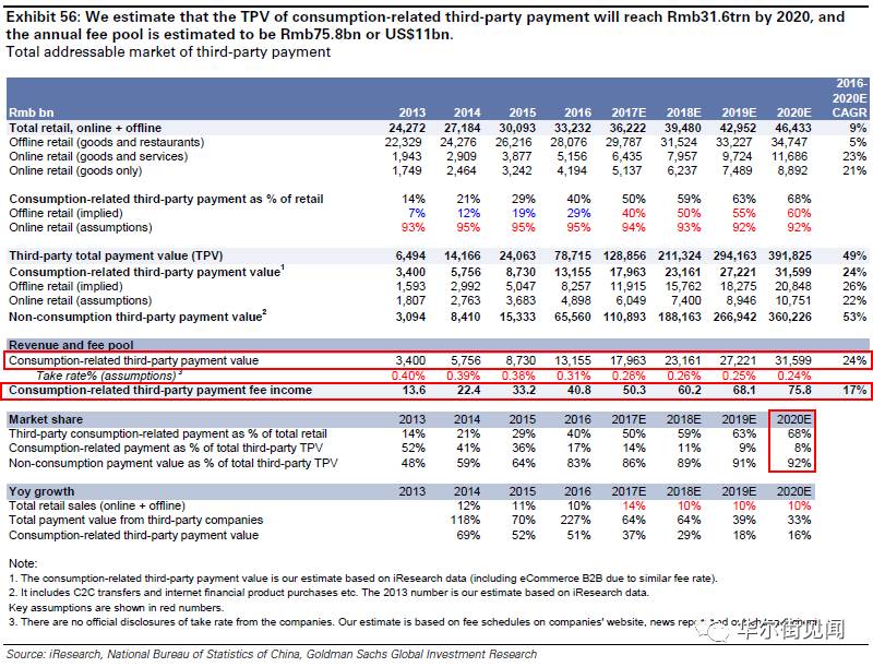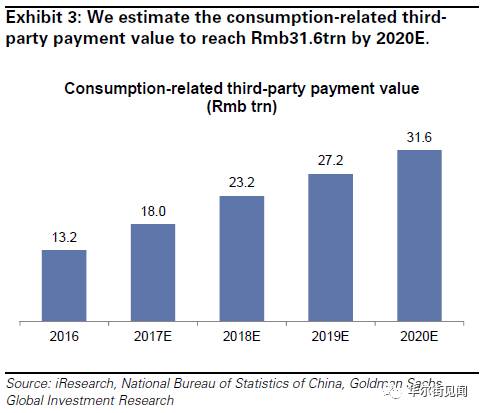 尤其是在第三方支付领域,高盛预计,消费相关的第三方支付市场规模将在2020年达到31.6万亿人民币(截止2016年数据为13万亿人民币,下图),扩张近2.5倍,年均复合增长率24%。