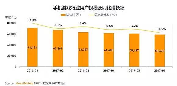 另一方面,虽然今年上半年游戏行业整体实际销售收入近千亿,达到997.8亿元,同比增长26.7%。但游戏用户数量呈现放缓的趋势已不是公开的事实。中国游戏用户规模5.07亿人,同比增长3.6%,增速继续下滑。根据QuestMobile的数据,2017年6月,手游用户下滑比率甚至达到14.9%。