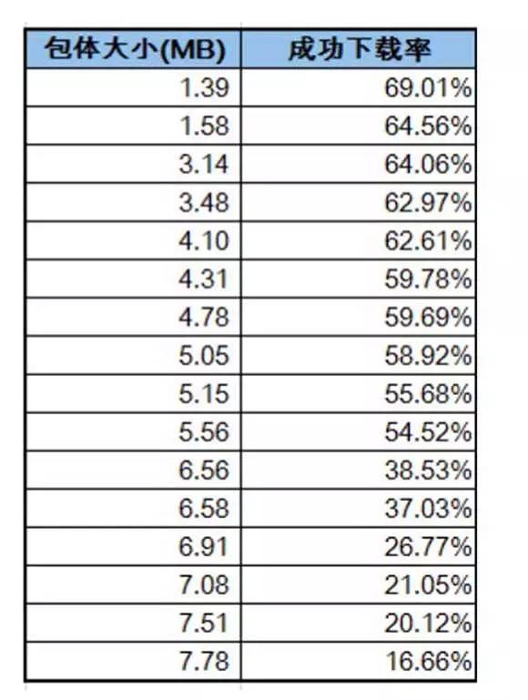 比如,对于海外一些网络基础设施不完善的国家,游戏包的大小甚至会成为用户考虑是否下载的关键词因素,如下图所示,这是米飞提供的在其平台上文件大小与下载成功率的关系: