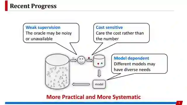 最近还有很多工作依然在关注选择标准的制定上,但是我个人感觉这一年来在主动学习方面的进展,开始倾向于考虑更实际的应用场景,而且更系统的考虑整个学习过程中各个环节。这主要体现在三个方面: