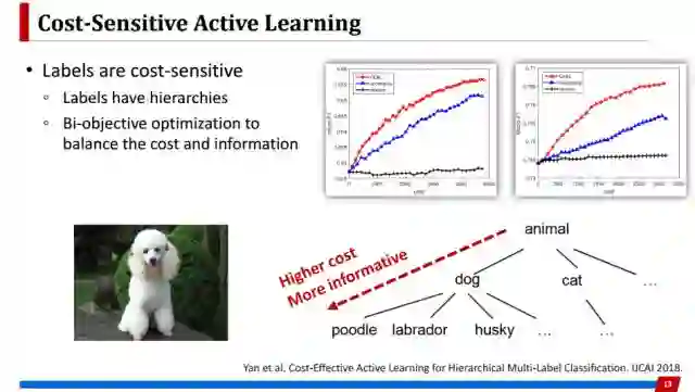 另外一个是标记本身也是有代价敏感的。比如在多标记任务里,多个标记可能形成这样层次化的结构,越底层的标记描述信息越具体。但是oracle在标注的时候需要花费更多的时间,所以需要有一种方法平衡信息量和标注代价之间的矛盾。这个工作采取的是多目标优化方法来平衡,而且取得很好效果。