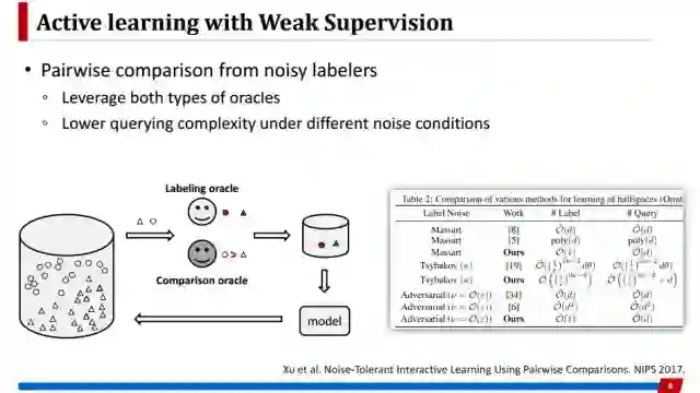 这个工作是考虑到另外一种情况,他有两个oracle,一个oracle是去提供样本标记,另一个oracle是针对两个样本,告诉你这两个样本里哪个更可能是正样本。他提供这样一种比较的信息,所以也是一种弱监督的信息。这个工作的主要贡献是在不同噪声条件下提供关于查询复杂度的理论保证。