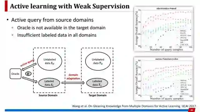这个工作考虑的是极端情况,某些任务里面连oracle都没有,比如涉及到敏感信息或者安全信息,或者任务要求领域知识非常强,这时候没有Oracle能够提供更多标注。所以我们希望从相关任务里去查询新的样本,把这个样本迁移过来学习,从而帮助目标任务的学习。这个工作的挑战在于,如果把主动学习和迁移学习两个任务独立考虑,有可能挑出来的样本对source domain有帮助,但迁移过来之后对target domain并没有帮助,这就是挑战所在,这工作是基于2016年IJCAI的一个类似工作扩展来的,只是把source domain由一个扩展到多个的情况。