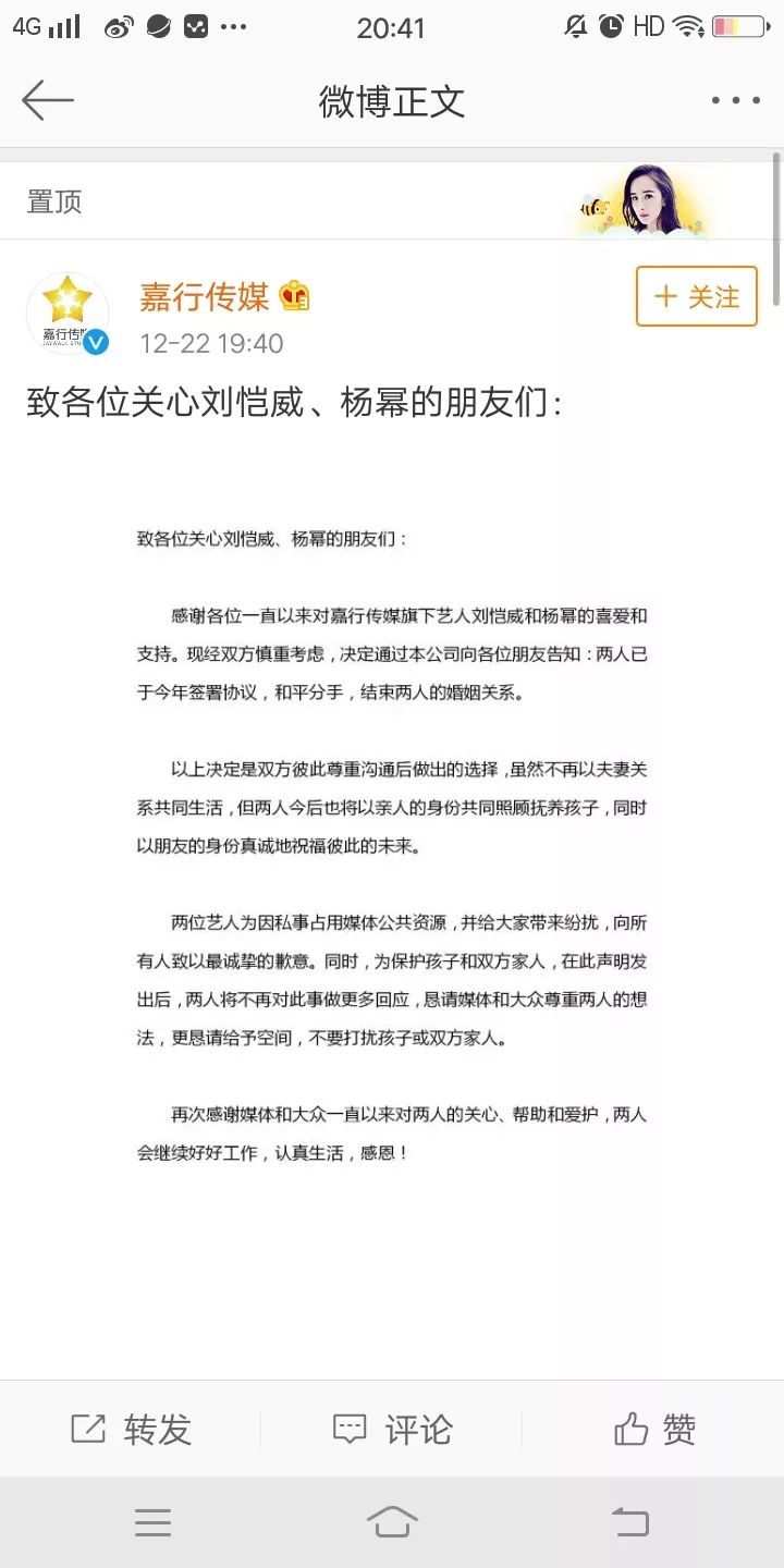 即便如此,当昨天(12月22日)晚上,杨幂和刘恺威突然宣布离婚时,还是让吃瓜群众惊讶。这段尚未到“七年之痒”的婚姻终于以“和平分手”四个字画上了句号。