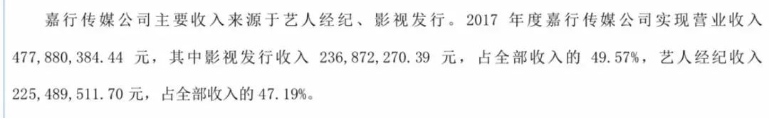 艺人经纪收入是嘉行传媒营收的关键,据嘉行传媒2017年年报显示,2017年嘉行传媒总营收4.78亿元,艺人经纪收入为2.254亿元,占当年总营收的47.19%。