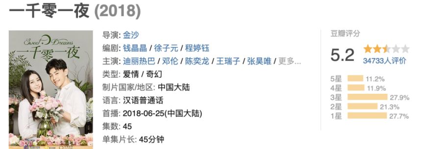 迪丽热巴接连几部作品都口碑不佳,除了主演的《烈火如歌》外,《一千零一夜》也未得到观众认可,豆瓣评分仅5.2分。嘉行传媒其他新人更难以独当一面。
