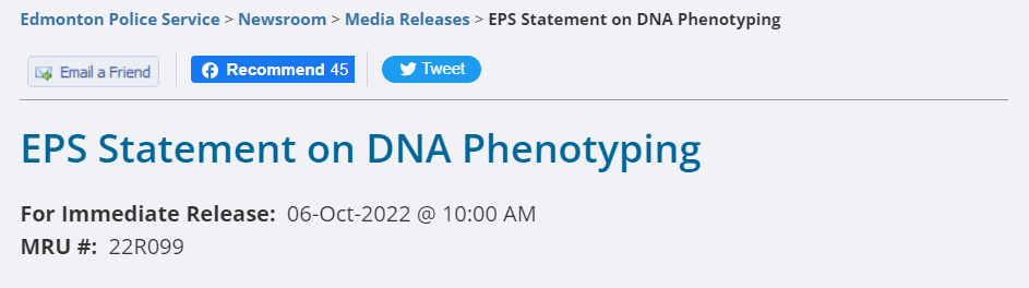 埃德蒙顿警察局后续又发布了一份新闻稿,宣布从其网站和社交媒体上删除了这张合成图片,以回应照片发布和DNA表型分析技术使用后的批评。