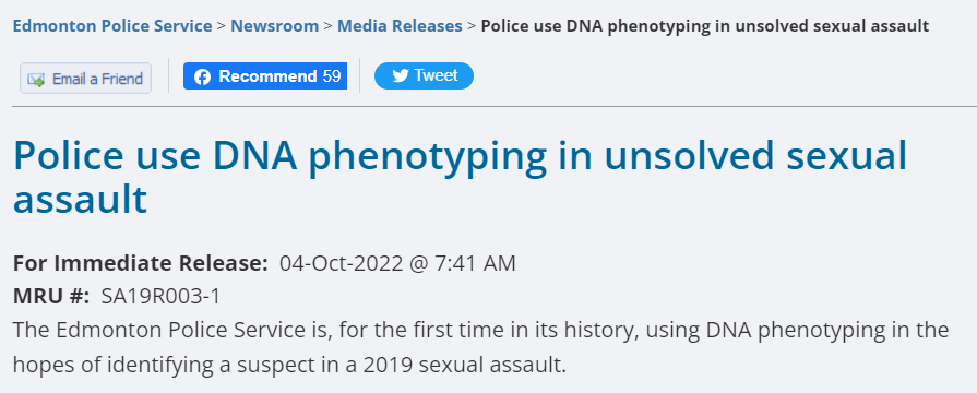 最近位于加拿大的埃德蒙顿警察局(EPS)公布了一张2019年性侵案嫌疑人的合成照片,由Parabon NanoLabs公司使用DNA表型(phenotyping)分析技术对掌握的DNA证据进行面部合成。
