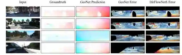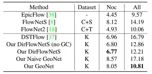 图2:直接光流学习方法DirFlowNetS和本文的方法GeoNet结果的比较。如图中所示:GeoNet在遮挡、纹理模糊、甚至阴影区域都显示出明显的优势。