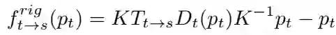 深度估计网络输入为单幅图像,输出为其对应的深度图。姿态估计网络输入为整个图像序列,直接回归出每一个时刻的相机位姿。这两个网络组成了静态场景重构器。其监督信息为像素一致性。具体来说就是:当得到场景的深度和相机的位姿,通过下式: