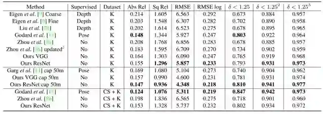 表1:KITTI 2015数据集上深度估计的结果。就训练集而言,K表示KITTI数据集,CS表示Cityscapes数据集。在KITTI数据集上训练的最优结果加粗表示。Garg et al.的实验结果上限为50m深度,因此将其分开列出。