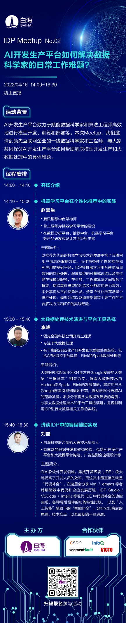 本次 Meetup,我们邀请到领先互联网企业的一线数据科学家和工程师——腾讯赵喜生和领先金融科技公司李峰,分别从个性化推荐场景和大数据处理的角度与大家共同探讨 AI 开发生产平台在其日常工作中的实践和经验。同时,白海科技联合创始人兼技术负责人刘喆将与大家分享 IDP 中编程辅助的实现,探秘 IDP 如何通过智能代码补全帮助用户提升模型开发效率。