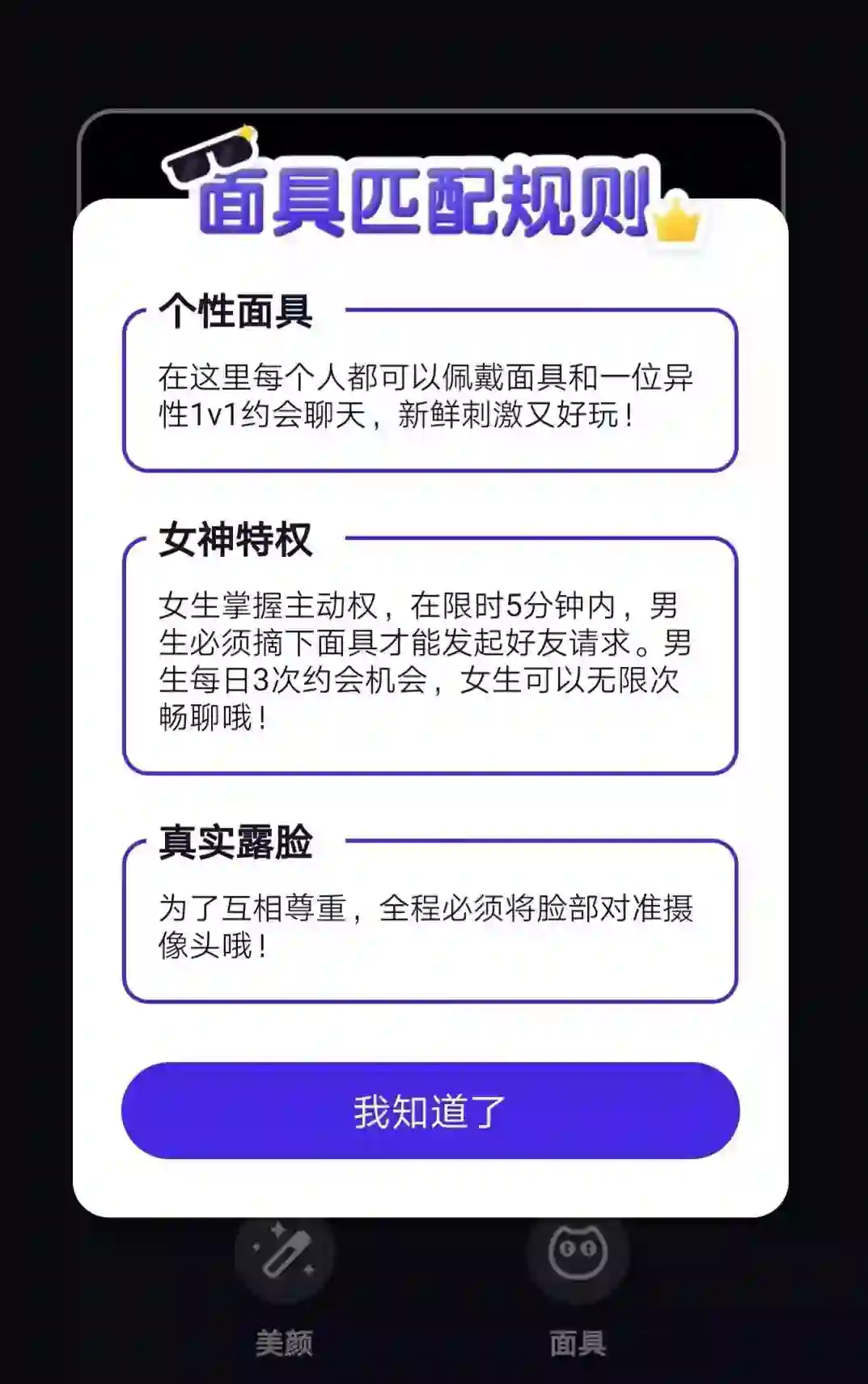 Tech星球注意到,产品发现页除附近的人外,最主要功能即为“面具匹配”,可匿名与平台用户进行限时5分钟的约会。规则中还表明,女生拥有主动权,可戴面具进行无限次畅聊;而男生必须摘下面具,且每天仅拥有3次机会。
