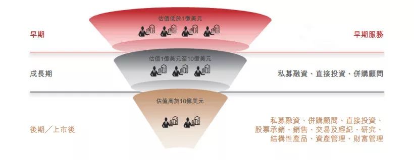 基于漏斗模型,华兴要讲述的故事是:串联起创业早期、成长期、后期以及上市后企业的三大成长历程,并根据不同阶段提供私募融资、直接投资、并购、股票承销、资产管理等全生命周期一站式的金融服务。