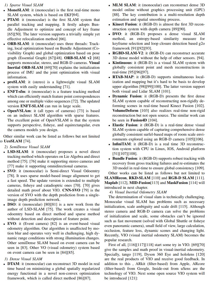2.视觉slam涉及视觉传感器的原理介绍,产品选型,开源视觉slam系统和视觉惯性系统的介绍,比较,分类。而后介绍了深度学习在视觉slam中的应用,以及视觉slam的挑战和未来。
