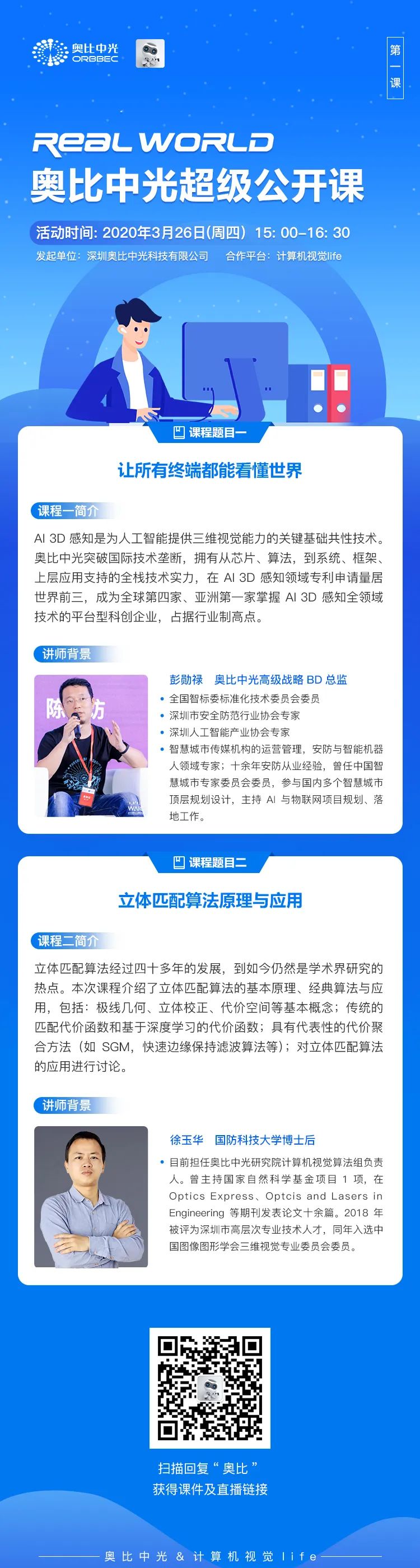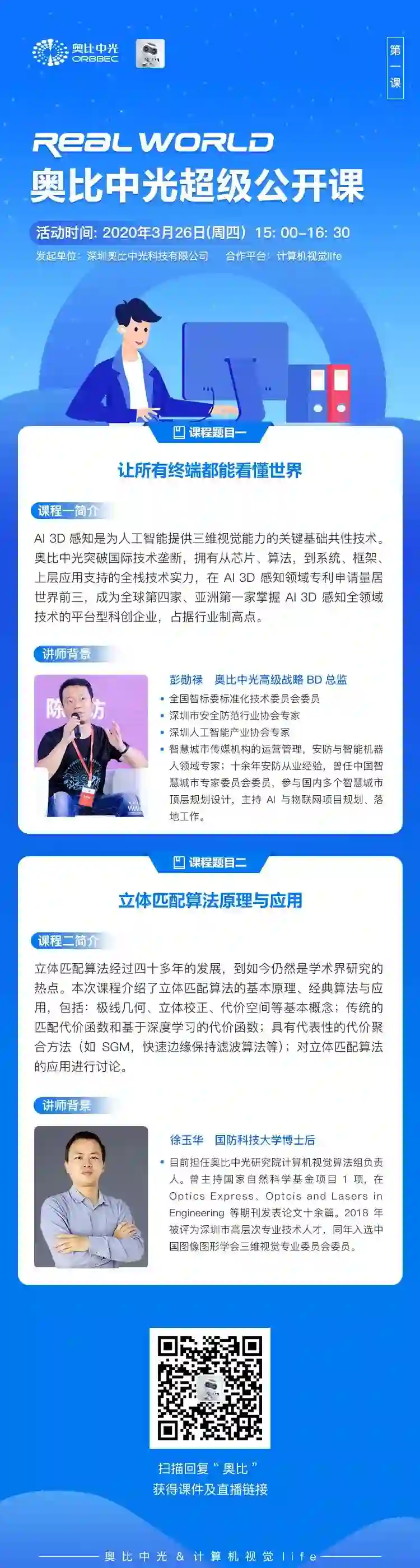 奥比中光公司致力于AI 3D感知领域,不仅是行业的标杆和制高点,更是全球第四家、亚洲第一家掌握AI 3D感知全领域技术的平台型科创企业,本次带来的公开课也是干货满满,分为《立体匹配算法原理与应用》《3D感知技术简介与发展历程》,学习技术的同时能真正感受到技术的实用,不管是对新手小白,还是正在学习或者求职的小伙伴都是非常受用的,千万不要错过哦!