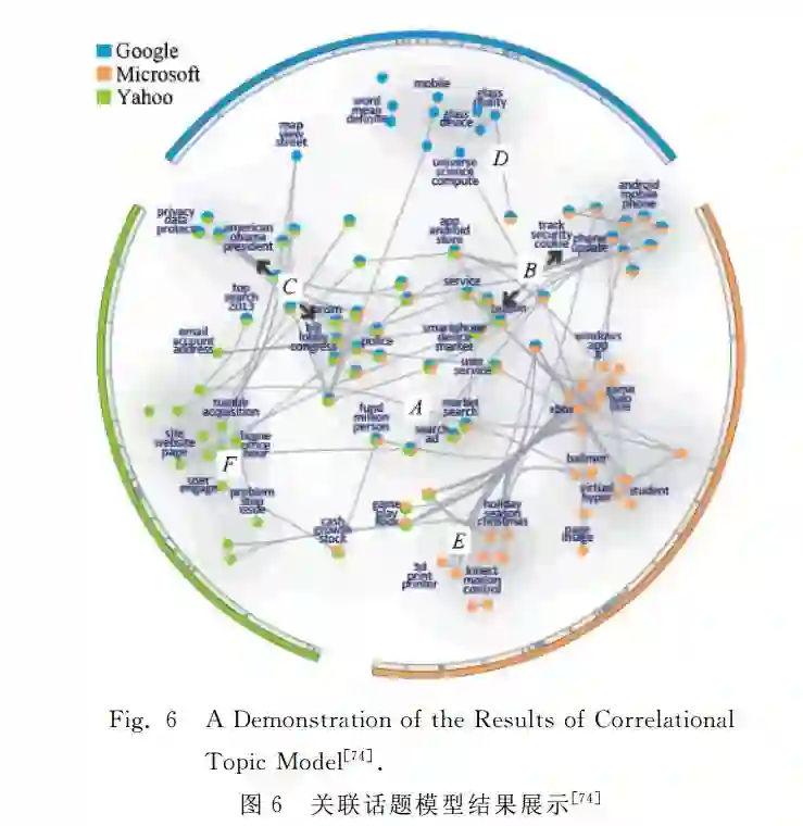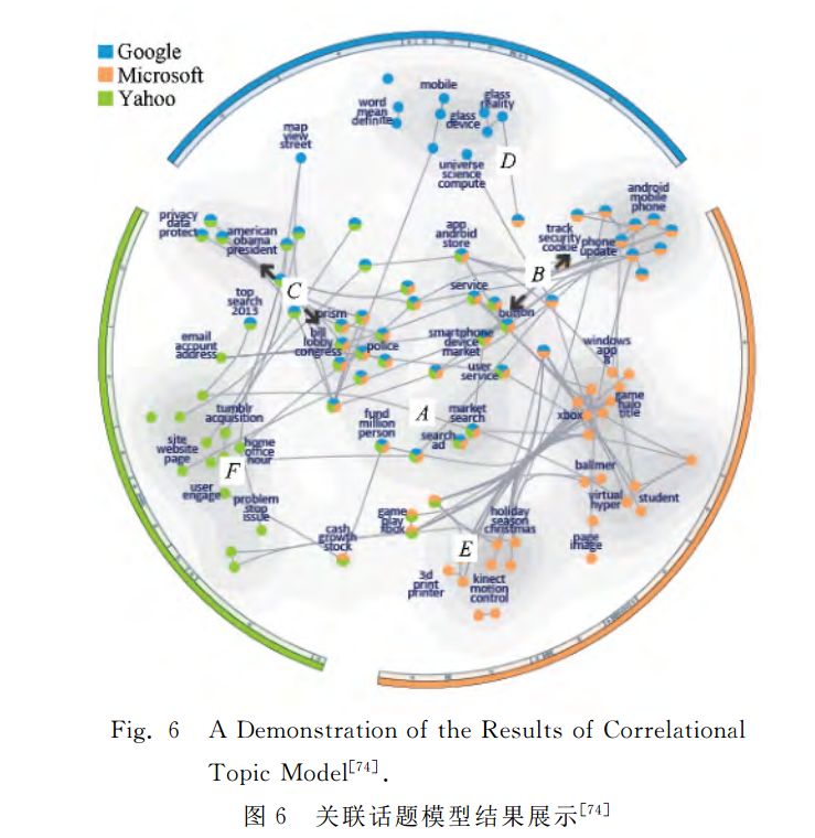 在上述大规模主题图结构的学习基础上,进一步开发了“主题全景图”(TopicPanorama)可视化界面,它可以将多个主题图结构进行融合,并且以用户友好的方式展现在同一个界面上,如图6所示,其中每个节点代表一个主题,节点之间的边代表相关联关系,边的长度代表关联强度,所用数据集为微软、谷歌、雅虎等3个IT公司相关的新闻网页。该可视化工具具有多种交互功能,用户可以使用放大或缩小功能对主题图的局部进行仔细查看,同时,也可以修改图的结构并反馈给后台算法进行在线调整。多位领域专家一致同意该工具可以方便分析社交媒体数据。更多具体描述参见文献[74]。