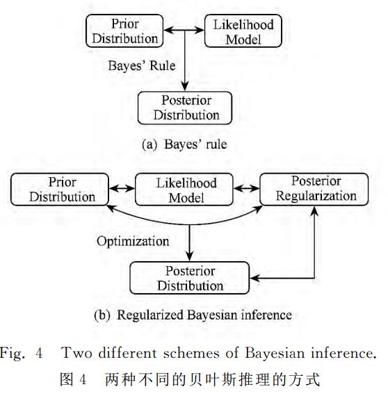 在第2节中提到了贝叶斯方法的两种等价表现方式,一种是后验推理的方式,另一种是基于变分分析的优化方法,其中第2种方式在近年有了较大发展.基于这种等价关系,我们近年来提出了正则化贝叶斯(regularized Bayesian inference, RegBayes)理论[10]:如图4所示,在经典贝叶斯推理过程中,后验分布只能从两个维度来获得,即先验分布和似然函数;而在正则化贝叶斯推理中,后验推理转化成一种变分优化的方式,通过引入后验正则化,为贝叶斯推理提供了第3维自由度,极大地丰富了贝叶斯模型的灵活性。在RegBayes理论的指导下,我们系统研究了基于最大间隔准则的判别式贝叶斯学习以及结合领域知识的贝叶斯学习等,取得了一系列的成果[]。