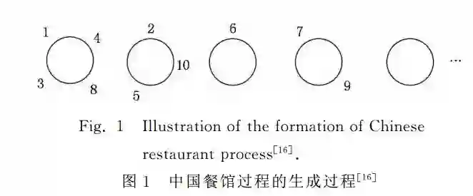 与狄利克雷过程等价的一个随机过程是中国餐馆过程(Chinese restaurant process, CRP)[19]。中国餐馆过程是定义在实数域上的具有聚类特性的一类随机过程,也因为其特有的较好展示特性而被经常使用。如图1所示,在中国餐馆过程中,假设有无限张餐桌和若干客人;其中第1名顾客选择第1张餐桌,之后的顾客按照多项式分布选择餐桌,其中选择每张餐桌的概率正比于该餐桌现在所坐的人数,同时以一定概率(正比于参数α)选择一个没人的餐桌.可以看到,当所有的客人选择完毕餐桌,我们可以按照餐桌来对客人进行一个划分.这里每张餐桌代表一个聚类,每个客人代表一个数据点。