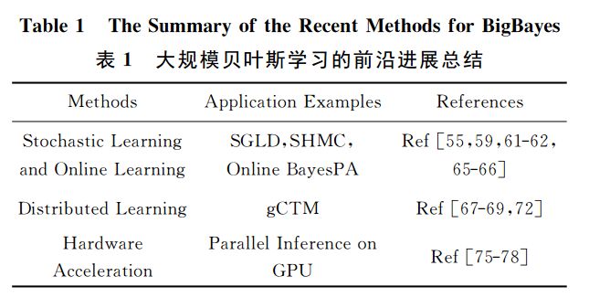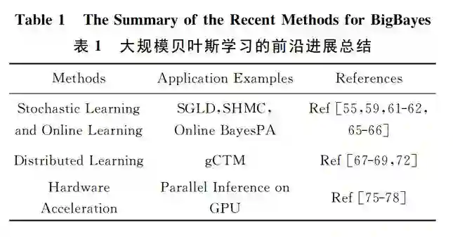 随着互联网技术的发展,研究面向大数据的机器学习理论、算法及应用成为当前研究的热点[[59]59],得到学术界和工业界的广泛关注。贝叶斯模型有较好的数据适应性和可扩展性,在很多经典问题上都取得了很好的效果,但是,传统贝叶斯模型的一个较大的问题在于其推理方法通常较慢,特别是在大数据背景下很难适应新的模型的要求。因此,如何进行大规模贝叶斯学习方法是学术界的重要挑战之一。可喜的是近期在大数据贝叶斯学习(big Bayesian learning, BigBayes)方面取得了显著的进展。下面简单介绍在随机算法及分布式算法方面的进展,并以我们的部分研究成果作为示例。表1所示为对目前的若干前沿进展简要总结: